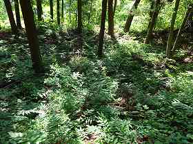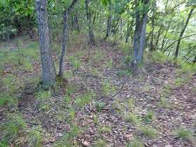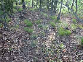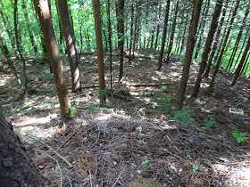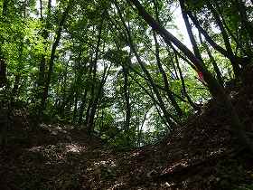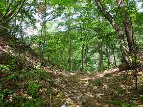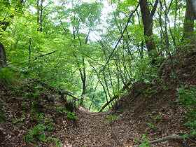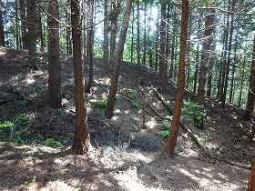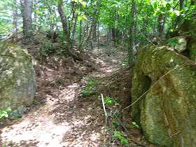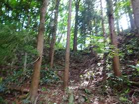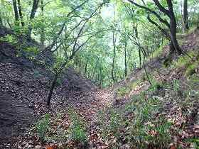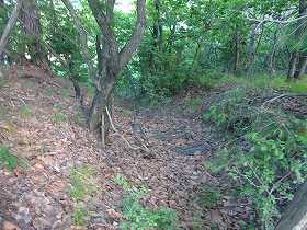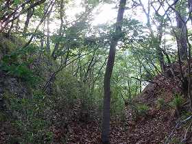 | そこからさらに背後の山稜に登っていけば6本の堀切を見ることができる。最初の堀切と虎口。 | 2本目の堀切。 |