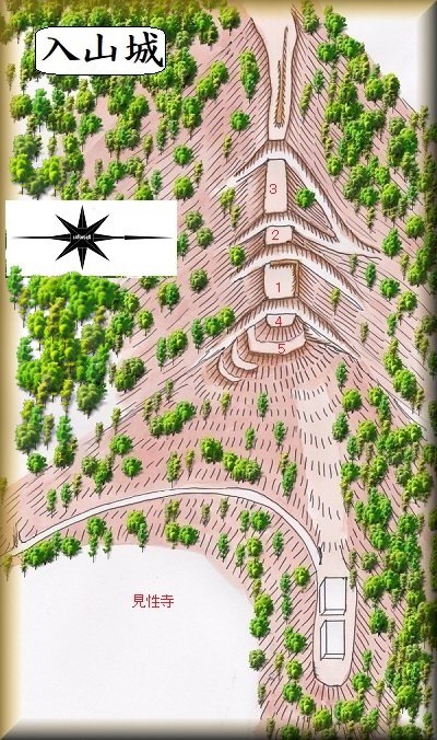 入山城は見性寺の背後にそびえる比高100mほどの山稜に築かれていた。東方の尾根の中腹部分には水道施設が造られており、そこまで車で行くことが可能である。車を停められるスペースもあり、ここから尾根を歩いて登っていく。