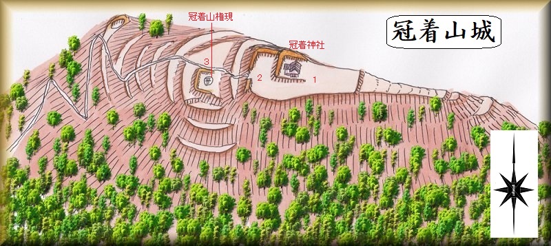 姨捨山とも呼ばれる、この地域の最高地点の山(比高850m)に冠着神社が祭られているのだが、ここがかつての城址でもあるとい高原)う。しかし、神社が祭られているということもあり、かなり上の方まで車で行くことができる。駐車場も完備されている。この位置である。ここから山頂まで、比高180mほど、20分ほどの行程である。
