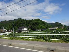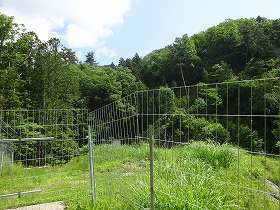 | 竜王城から向かう途中に見えてくる小坂城(右)と上の堀切群のある山稜(左)。 | 西側のトンネル上から登っていくと柵がある。これを開けて中に入っていく。 |