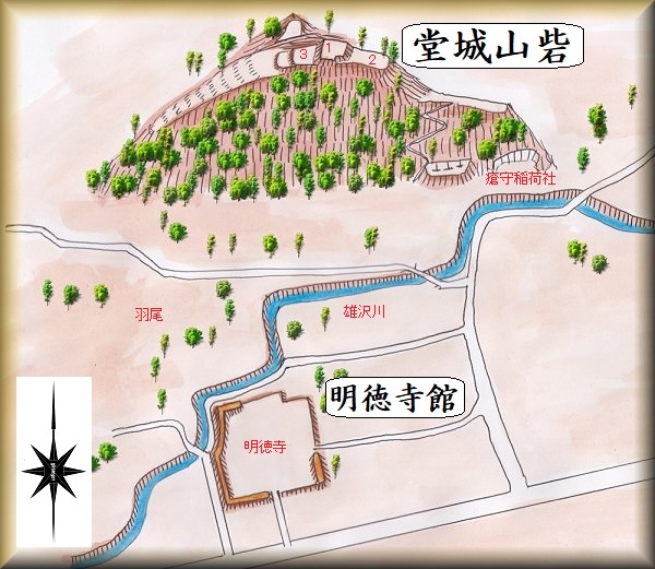 また、明徳寺の北側200mほどのところにある比高50mほどの独立山は堂城山と呼ばれ、詰めの城があったところであると推定されている。高さはたいしたことはないが、平野部の中の独立山であるので、けっこう目立った地形となっている。