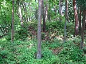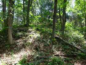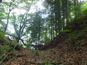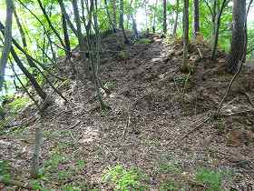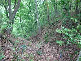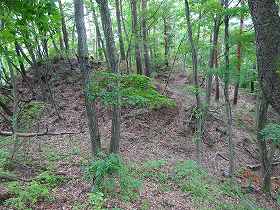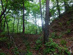 | 1郭から2郭城塁を見たところ。 | 2郭背後の大堀切。 |