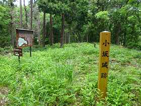 ここまでくると「←小坂城址」の案内が出ているのが見える。車で上がれそうな道だが、その先に鉄柵があるので、車は登り口の脇に無理やり寄せておくしかない。