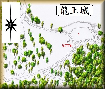 集落をはずれていくと道は少し狭くなっていくが、要所要所に「竜王城→」といった案内が出ているので迷うことはない。やがて、道がカーブしているところに竜王城の案内板が立てられているのが目に入ってくるので、城に到達したことが分かる。