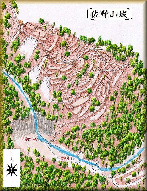 地図にも掲載されている不動の滝の上の比高100mほどの山稜に佐野城は築かれている。したがって城を訪れるには、この滝を目指していけばよい。