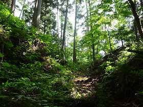 | 不動の滝。登り口はこの脇にあるので、まずは滝を目指すとよい。 | 登城道の途中には多数の削平地が見られる。 |