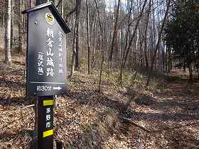 登城道は2か所あり、その入り口は東側のこの部分と西側のこの部分とであり、どちらから登っても手間は変わらないと思う。朝倉城址を示す案内は、湯川城の下あたりから出ており、城址まで迷うことはない。東側の登城口を示す案内は下の道からも出ており、かなり訪問者に親切な城であると言える。