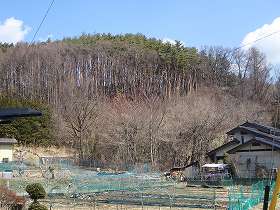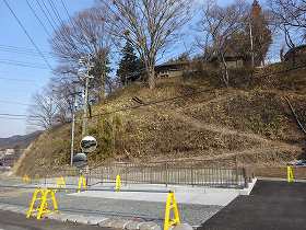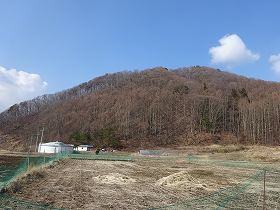 | 東側から遠望する朝倉山。ここからの比高は150mほど。 | 西側の登城道入口。 |