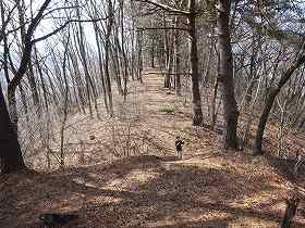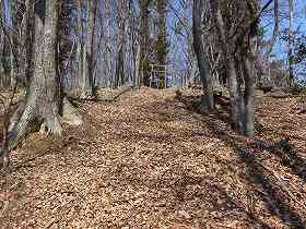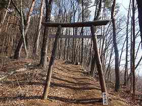 最初は緩やかな山道であるが、尾根の所で東側から登ってくる道と合流した。その上に木の鳥居が建てられており、後は城址まで急斜面の登りとなる。しかし、天気が良く気候も良いので、山歩きもまったく苦痛ではない。