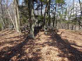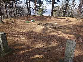 登って行ったところが1郭である。1郭は楕円形をしており、長軸30mほどある。周囲には土塁がきれいに巡らされているので、内部は擂鉢のように見えている。ここに案内板が設置されていた。印象的だったのは、この周囲の土塁の上に石柱がぐるりと取り囲むように多数建てられていたことである。何かの信仰上のものなのであろうか。