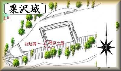 台地の西端には粟沢観音が祭られており、その周囲の土手などは、城塁状の形状を示している。