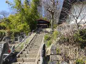 | 南側から遠望する埴原田城。ここからの比高は30mほど。 | 東側にある観音堂の石段。ここから登るのが分かりやすい。 |