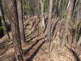 堀切の先には4郭が設定されている。ただし、削平は甘い郭となっている。その先は尾根が降って行き、何カ所か堀状の地形が見られるのだが、いずれも小規模なものばかりである。実質的な城域は4郭までと見てよさそうである。