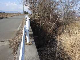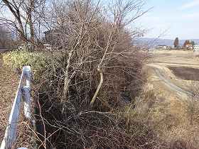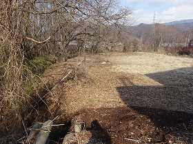 湯川城は、功徳寺の西300mほどの台地先端部にあり、googlemapには枡形城として掲載されている。古図を見ると、かつては丸馬出しを備えた平城であったようで、典型的な武田の城である。この痕跡が見られるのではないかと思って楽しみにしていたのだが、残念ながら、丸馬出しやその周辺の遺構はすっかり消滅してしまったようである。