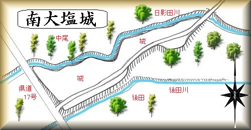 南大塩城は、国道152号線の山寺上交差点の東南200mほどの所にある。南北を川に囲まれた細長い台地上である。