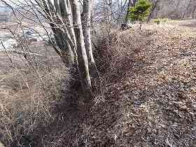ここから西側が尾根続きとなっており、ここに城内唯一の堀切が掘られている。ただし、規模は大きなものではなく、切岸部分も甘くなってしまっている。