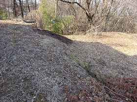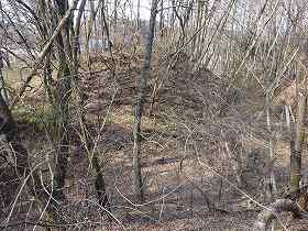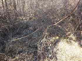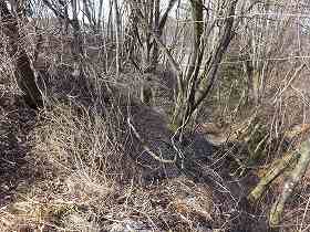 | 北側の堀切。天然の谷戸を利用しているのだろうが、かなり大規模なものである。 | 南側の堀切を挟んで、土塁状部分を見たところ。 |