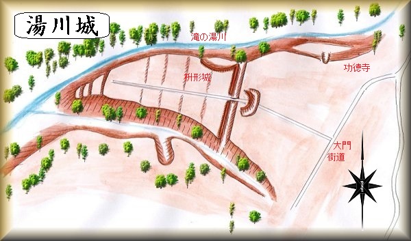 湯川城の歴史は古く、南北朝時代には集落が営まれており、湯川の宿で合戦も行われていたことが「市河経助軍忠状」により確認できるという。ということで、その時代から何らかの城郭的なものが存在していた可能性はある。上記の通りの要害地形にあるわけだから、古くから城郭が営まれていたとしても不思議はない場所である。