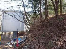 | 貯水施設と長林砦の城塁。ここまで車で来ることができる。 | 貯水施設との間の鞍部から見る干沢城主郭北側の城塁。 |