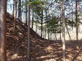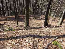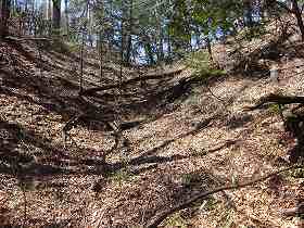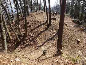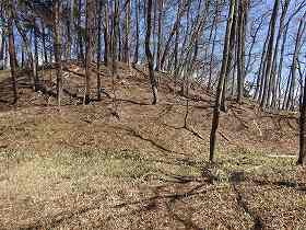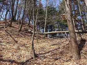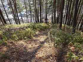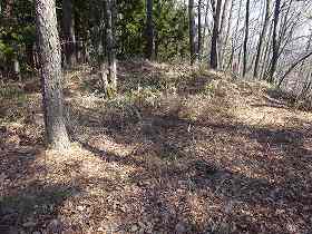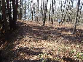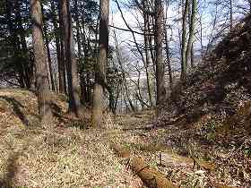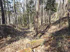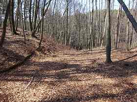 | 2本目と3本目の堀切を遠望したところ。2本目と三本目はかなり深く掘られている。 | 2本目の堀切。 |