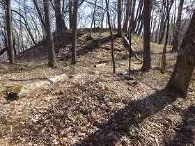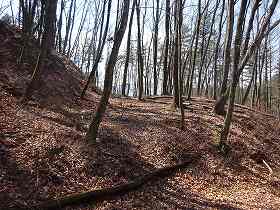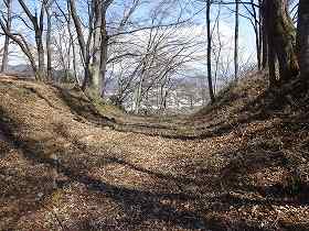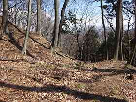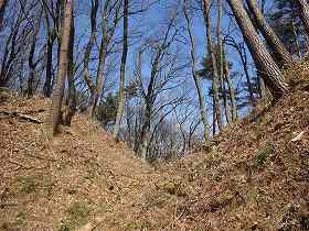 | 1郭北側の土塁。 | 1郭北側の堀切は幅広で、東側は二重堀切のようになっている。 |