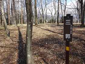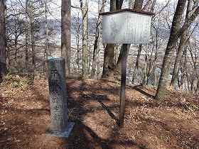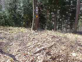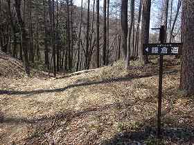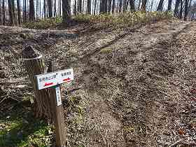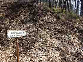 | 西側側面部下には幅広の平場がある。 | その下にあった案内表示。これによると東側に城山入口があるようなのだが・・・実際には登城口は見つけられなかった。 |