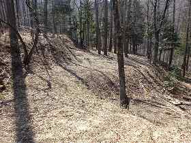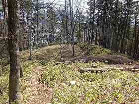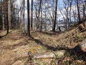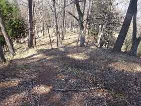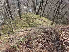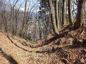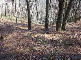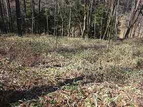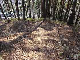 | 2郭下の帯曲輪。 | その下にも帯曲輪が何段も造成されている。こちら側から登ってくる道が本来の大手道であったろう。 |
