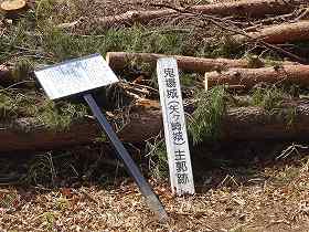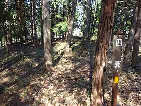 この最大の堀切を登ったところが1郭である。ご多分に漏れず、1郭には土塁が巡らされており、もっとも重要な郭であることが理解できる。ただ、現状ではここに切った木を置いているため、全体像を視認することができない。城址標柱と案内板も、郭内部に倒れ込んでしまっていた。1郭の規模は長軸20mほどで、多数の人数を籠城させることは難しい。