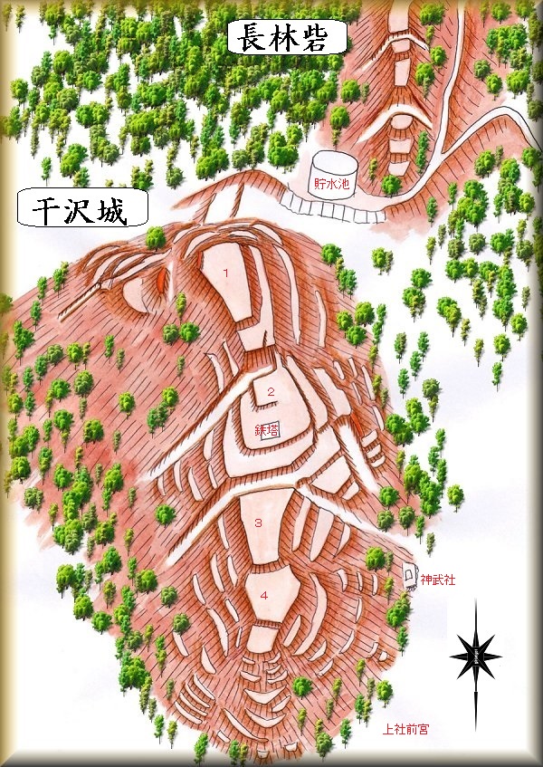 といったことで格式もあるからであろうか、城址はよく整備されており、山麓の諏訪大社方向から登城道が付けられている。しかし、地図を見てみると、干沢城の1郭のすぐ南側下には貯水タンクがあり、そこまで車で来ることも可能なようである。山登りが嫌いな私としては、当然このルートを選ぶことになる。