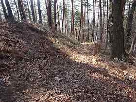 進んで行くと一段高くなった部分があり、それに登るとその先に3郭の城塁らしきものが見えてくる。ここからが城域である。3郭の手前には堀切状の区画が長く延びているが、これは現状ではただの通路のようになってしまっている。
