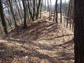 この土塁の背後の下には堀切が設置されており、その先には数段の段郭が形成されている。