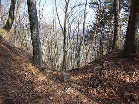 | 1郭と2郭の間の堀切。堀幅が10m以上ある。 | 堀は竪堀となって延びている。その途中から見た2郭。 |