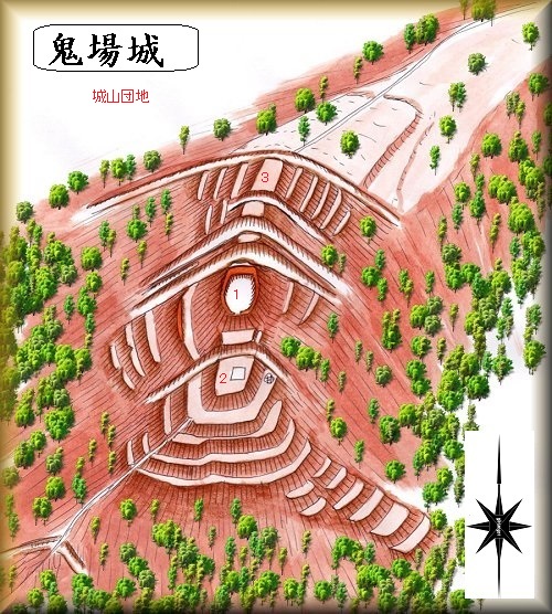 鬼場城は、鬼場の城山団地の東側に隣接する比高60mほどの山稜に築かれている。登城口は何カ所かあるようだが、団地の上から東側の山稜に入り込んでいく道があり、その途中に鬼場城入口の案内表示が出ている。これを進んで行けば、ほとんど平行移動で3郭まで到達することができる、といったようにアクセスは容易である。