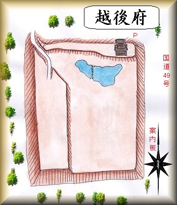 ここは立ち寄る予定には入っていなかったのであるが、堀越館から水原代官所に向かう途中、道路脇にいかにも城館らしい土手が見えてきたのが気になった。よく見ると、そこに「越後府」と書かれた大きな標柱があり、案内板も設置されている。