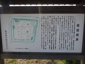 阿賀野市市野山にある堀金会館の辺りが、堀越館の跡であったようで、案内板が設置されている。しかし、この案内板、道路よりも少し奥に引っ込んだところにあり、しかも北西側を向いて立てられているので、南側からアクセスすると発見しにくい。