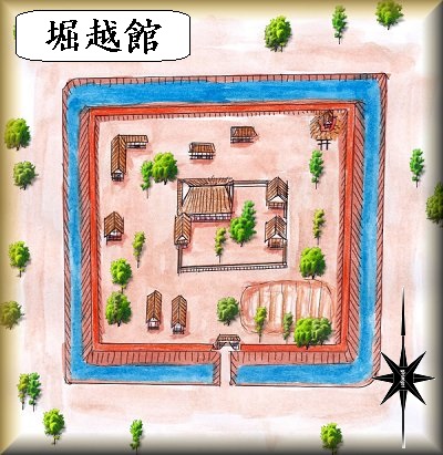 方100mほどの武士の館であり、内部には母屋や長屋などの他、馬小屋、畑などがあったようである。ただし、現地案内板の図では方角が描かれておらず、そのため右の鳥瞰図も方角がどうなっているのかは分からない。