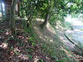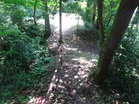 | 本丸東側の土塁。 | 土塁上から二ノ丸側の堀切を見下したところ。奥の方が2郭。 |