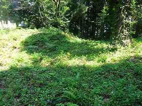 2郭の南側にも堀切があり、その先の郭が3および4である。3と4は大まかに2段の郭に造成されているのだが、実際には全体が墓地として造成されていて、かなり凸凹した地形になっている。4の先が土手となっているので、ここまでが城域であったものだろうか。4の先にあったと思われる堀は現在ではほとんど埋められてしまっているが、要するに、この辺りの地形はかなり改変されてしまっているようだ。