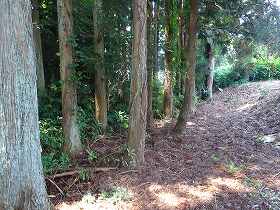 | 二ノ丸内部。細長く、小さな仏像がたくさん祭られている。、あた北側に土塁が盛られている。 | 三ノ丸との間の堀切。 |