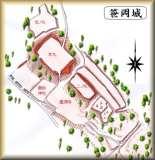 このように笹岡城は、主に3つの郭を連郭式に配置した城郭であった。南側の鑑洞寺も一段高い地形にあり、ここに居館が置かれていた可能性が高いのではないかと思われる。