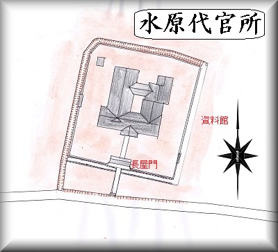 代官所内部に、旧状を描いた古図も掲げられていた。それを見ると、代官所の施設はかつての城館水原城の跡に建てられているということが分かる。水原城の中心部は方50mほどの郭であり、周囲を水堀によって囲まれていた。
