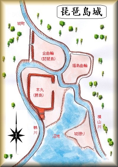 蛇行する川に囲まれた部分は、それぞれ琵琶島、福島、勝島と呼ばれており、その3つの島をそのまま郭として取り込んだ3郭構造の城郭であった。