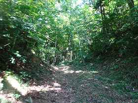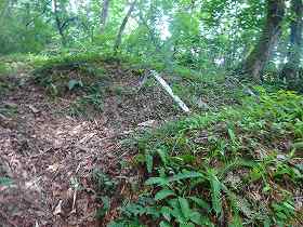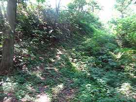| 1郭東側の大堀切。その先にも小規模な堀切が三重になっているらしい。 | 2郭との間の堀切。見事に薬研形状となっている。 |