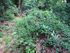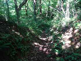畝状阻塁群を抜けて行くと、登城路は切通し状になっていく。さらにその上に案内があり、畝状竪堀群を通って1郭東側の大堀切の方へ行けるようになっている。ところが案内があるにもかかわらず、こちらはヤブに覆われてしまっているため、夏場では探索が難しい状況になっていた。