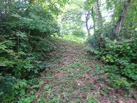 | 専称寺からの登城口。この少し先に駐車場がある。 | 上がったところの帯曲輪に畝状竪堀群があるが、ヤブで見にくい。 |