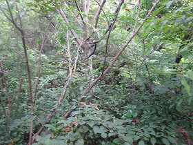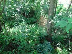 実城も、北側半分はヤブに覆われてしまっていた。それをかき分けで進んで行くと、北西側の切岸の所に出たのだが、こちらはさらにヤブがひどく見通しが利かない。こちらの下部が二ノ丸であり、虎口や腰曲輪、堀の跡もあるらしいのだが、夏場では、なかなか入り込んでは行けず、そちらを探索するのは難しい。