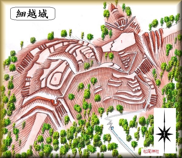 神社には駐車場もあるので、そこに車を停めて歩きだす。駐車場の脇には城の案内板が設置されており、そこに細越城の鳥瞰図や縄張り図が掲載されていた。