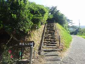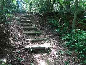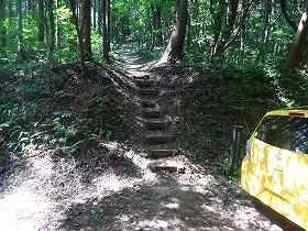 1郭の側面部にも登城道付けられており、こちらが普広寺からくる登城道となっている。こちらを降って行くと、斜面をそのまま降る階段となっており、郭の内部をまったく経由するようにはなっていない。ということで、この道は本来の登城道ではなく、遊歩道として後から付けられたものであるということが想像できる。