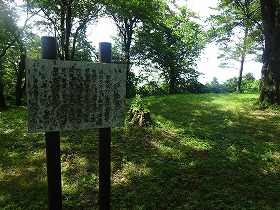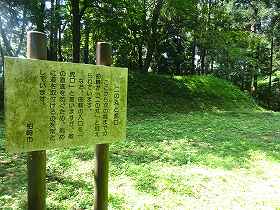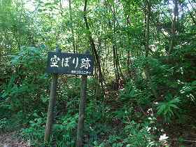 | 南側に進んで行くと、途中の右手に腰曲輪状の郭がある。 | 腰曲輪の間の窪んだところには空堀跡の案内が立てられていた。 |