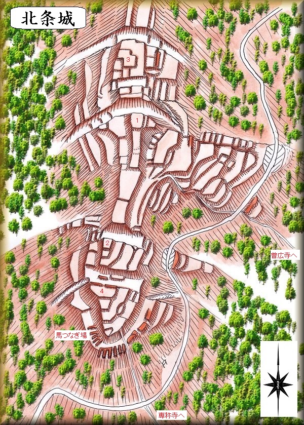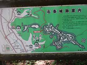 山登りの嫌いな私としては、当然、林道の上の方まで車で登るルートを選択した。専称寺の先の道をどんどん進んで行くと、やがて、城の入口の案内がある場所に到達する。これを過ぎて少し林道を進んで行くと、道路脇に駐車スペースがある部分があるので、車はそこに停めておくとよいであろう。その場所に北条城の案内板が設置されており、城の縄張図も掲載されているので参考になる。